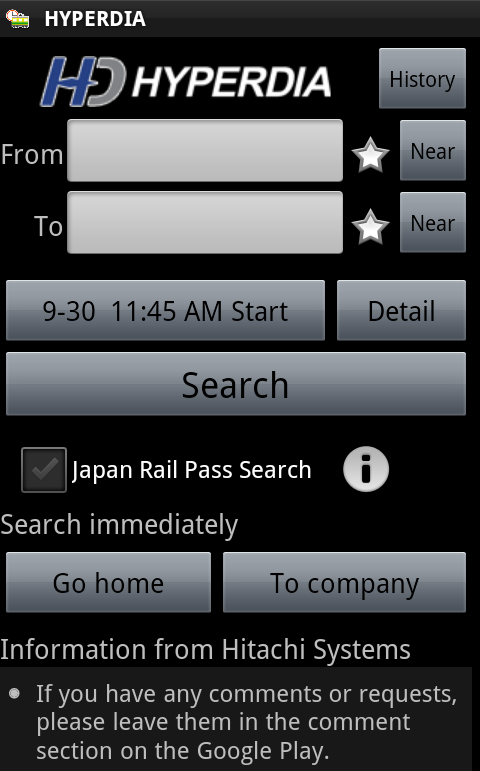 เสี่ยเติ้งแห่งร้านเรียนดี นครสวรรค์ (Atid Wangsuekul) แนะนำให้ลงโปรแกรม Hyperdia บน Android แต่ที่จริงใช้บน Web ก็มีที่ http://www.hyperdia.com/ ใช้ในการหาเส้นทางต่อรถไฟและรถใต้ดินที่ถูกต้อง เวลาแม่นยำ เชื่อถือได้ทั่วญี่ปุ่น มีติดตัวไว้ได้ใช้แน่ พร้อมบอกราคาเสร็จสรรพ จะเอาเร็วหรือเอาราคาเป็นที่ตั้ง เลือกเอาได้ แต่การป้อนชื่อสถานีต้องตรงเช่น สถานีนัมบะ- JR ต้องป้อน JR-NAMBA
